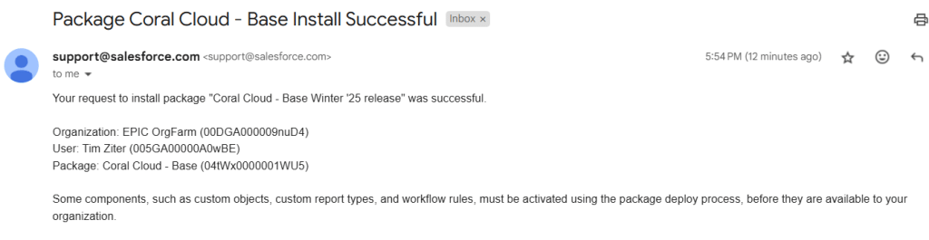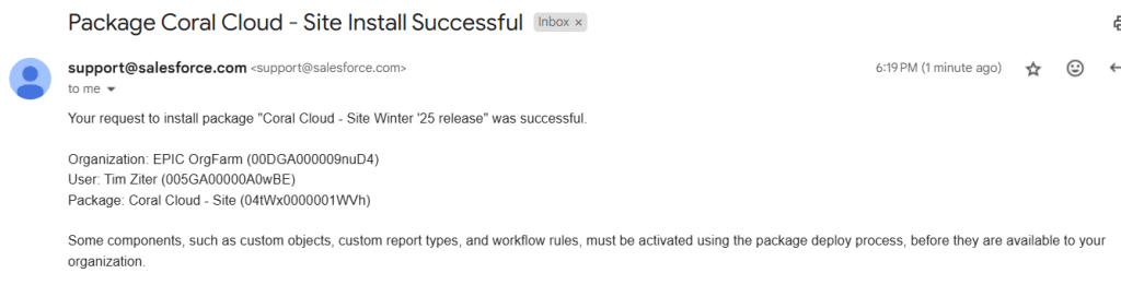 Follow the same steps as above, copying in the installed package url and you should have a successful installation. And you should receive an email confirmation as well.