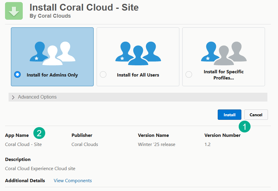 (1) The Install Coral Cloud – Base screen will appear. No need to change the settings, keep it as Install for Admins only.
