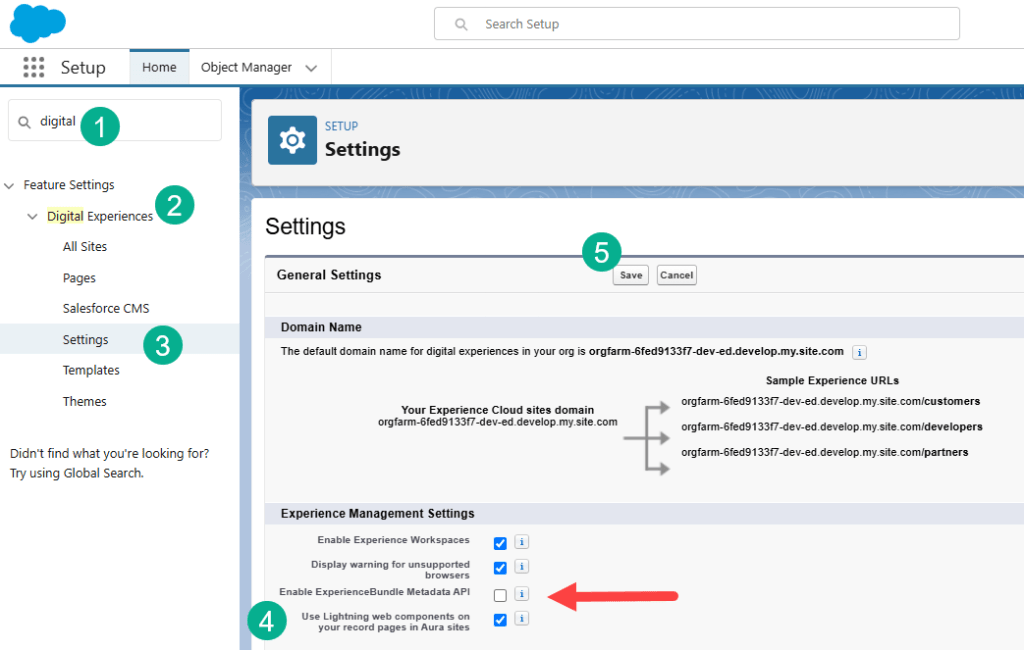 (1) You may encounter the error above where it asks you to Enable ExperienceBundle Metadata API in Digital Experiences | Settings.