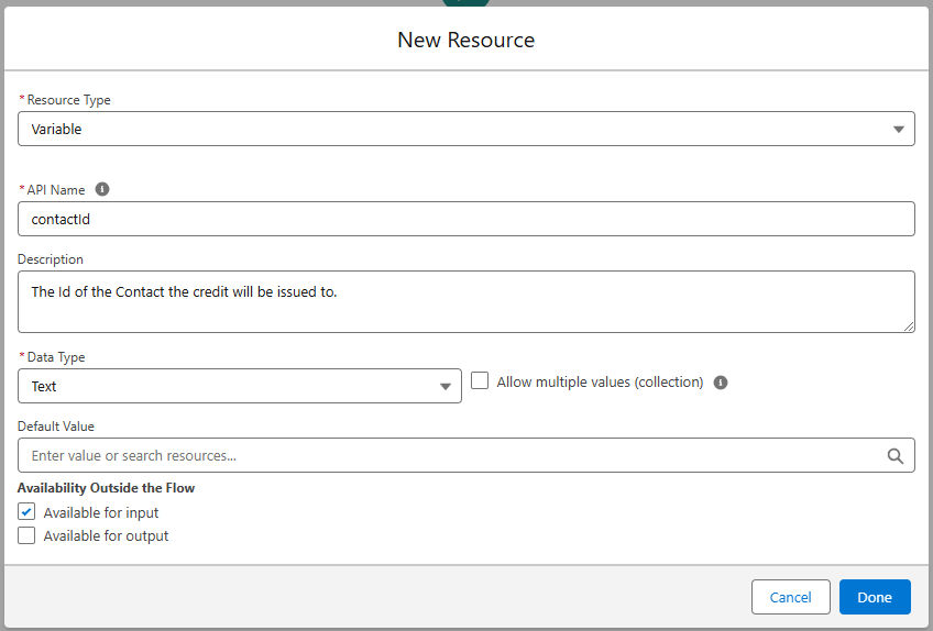 | Variable | contactid | The Id of the Contact the credit will be issued to. | Text | Checked | UnChecked |