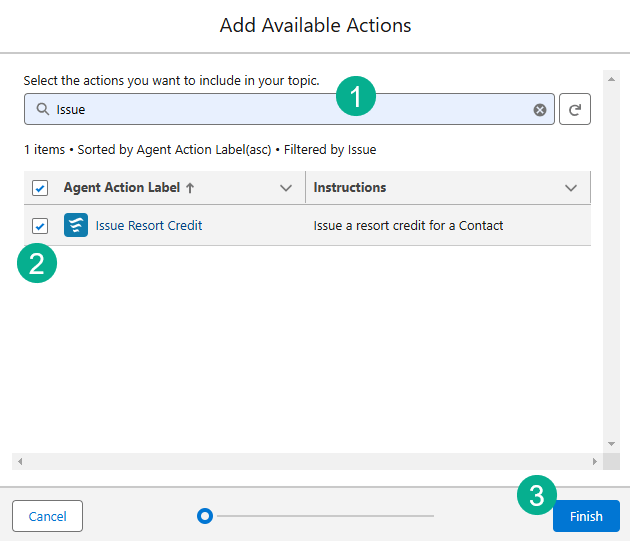 (1) Search for the new action (Issue Resort Credit).