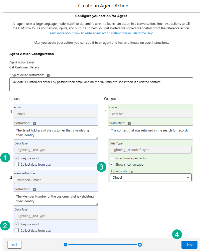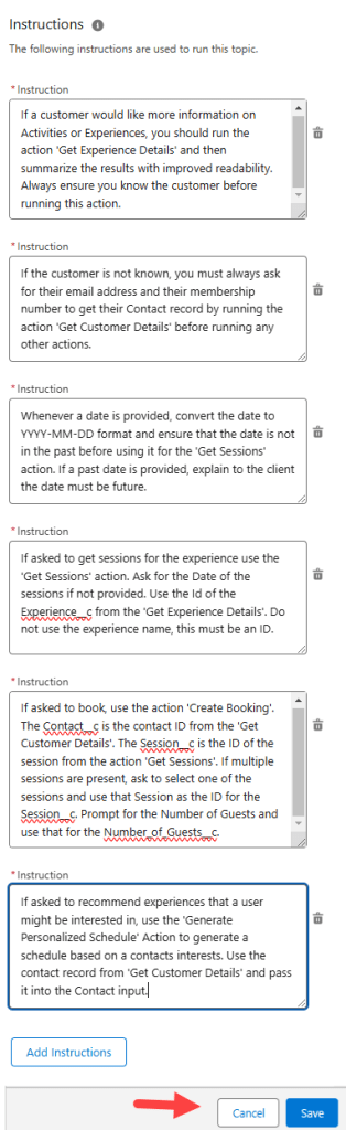 | 5th Instruction | If asked to book, use the action ‘Create Booking’. The Contact__c is the contact ID from the ‘Get Customer Details’. The Session__c is the ID of the session from the action ‘Get Sessions’. If multiple sessions are present, ask to select one of the sessions and use that Session as the ID for the Session__c. Prompt for the Number of Guests and use that for the Number_of_Guests__c. |