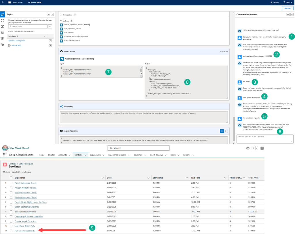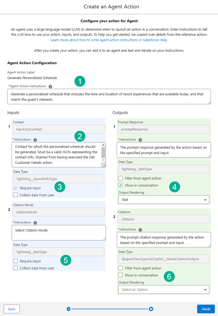 | 6th Instruction | If asked to recommend experiences that a user might be interested in, use the ‘Generate Personalized Schedule’ Action to generate a schedule based on a contacts interests. Use the contact record from ‘Get Customer Details’ and pass it into the Contact input. |