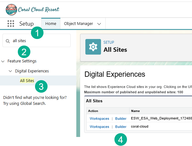 (4) Click on the Builder link on the coral-cloud Experience Cloud site.