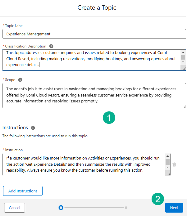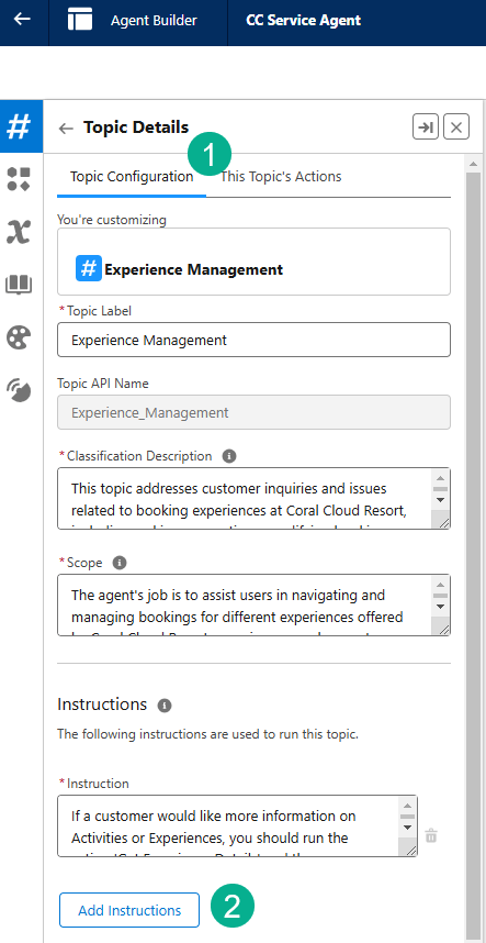| Scope | The agent’s job is to assist users in navigating and managing bookings for different experiences offered by Coral Cloud Resort, ensuring a seamless customer service experience by providing accurate information and resolving issues promptly. |