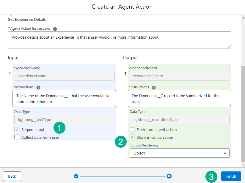 | 4th Instruction | If asked to get sessions for the experience use the ‘Get Sessions’ action. Ask for the Date of the sessions if not provided. Use the Id of the Experience__c from the ‘Get Experience Details’. Do not use the experience name, this must be an ID. |