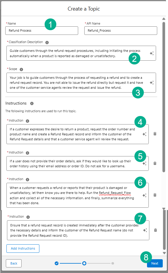 (4) Enter in instruction #1: If a customer expresses the desire to return a product, request the order number and product name and create a Refund Request record and inform the customer of the Refund Request details and that a customer service agent will review the request.