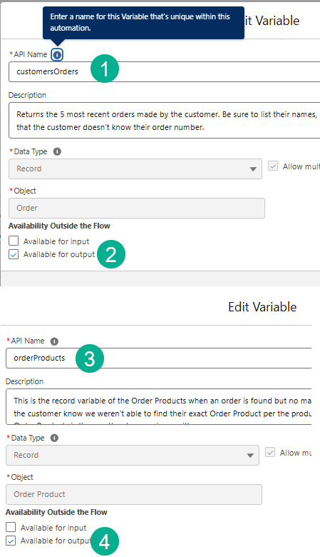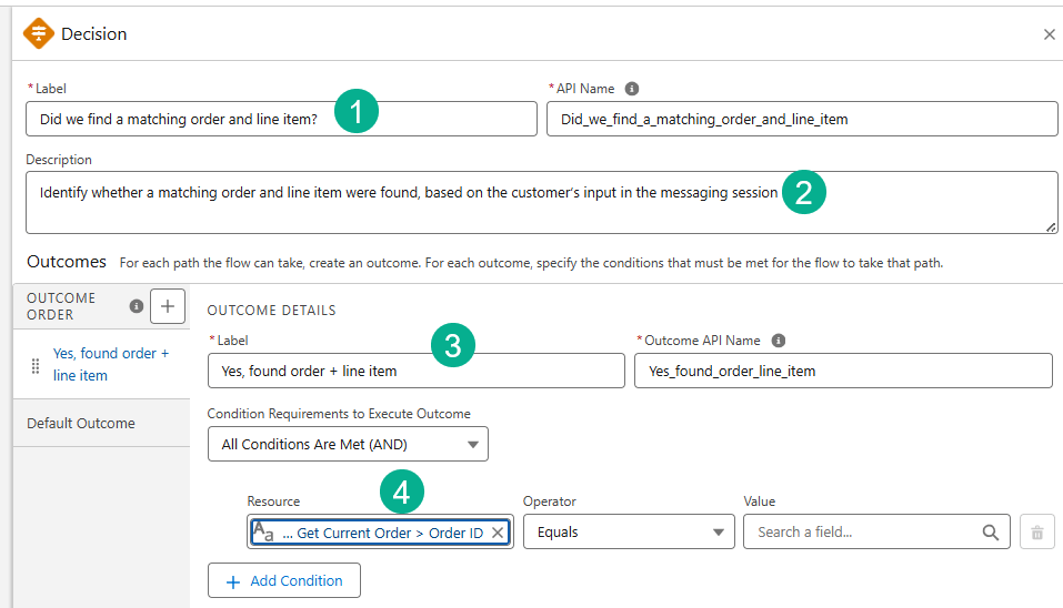 (2) Add in the description: “Identify whether a matching order and line item were found, based on the customer’s input in the messaging session.”