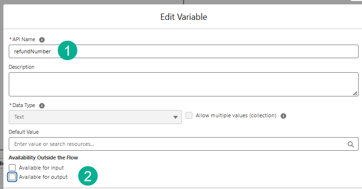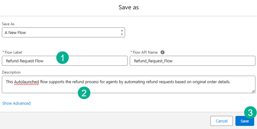 (2) In Description paste in: This Autolaunched flow supports the refund process for agents by automating refund requests based on original order details.