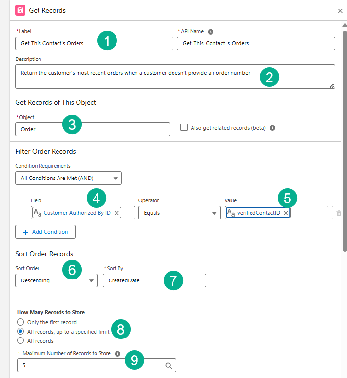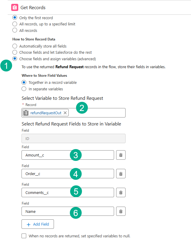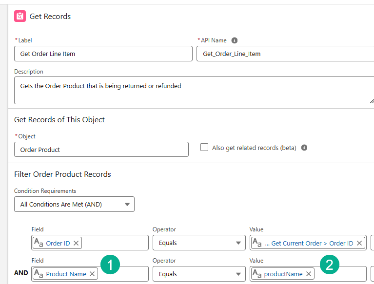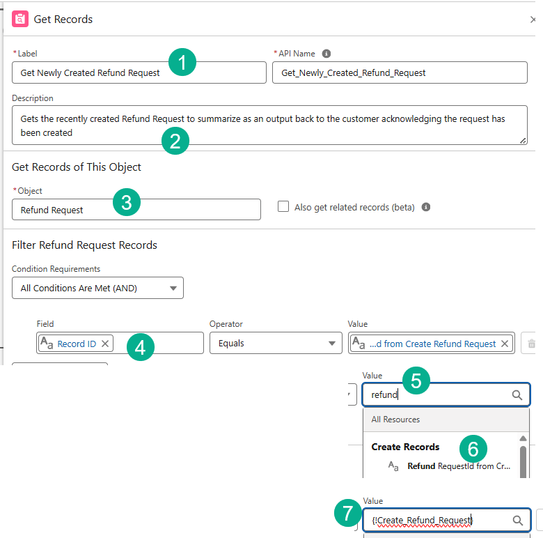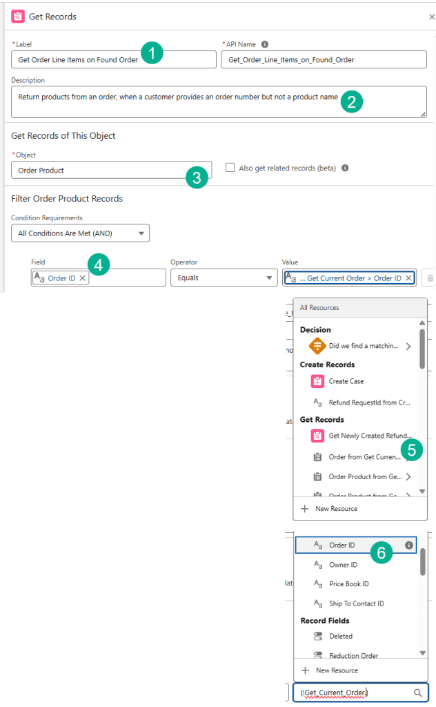 (3) Add description: Gets information about the order the customer is requesting a refund for, gets order details, and uses those details to create a Refund Request record.