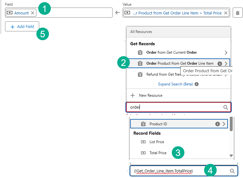(2) In the Value field search for Order and select Order Product from Get Order Line Item.