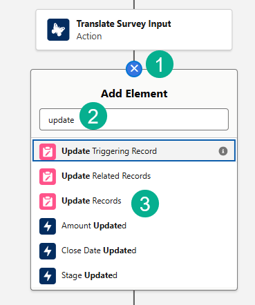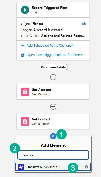 (1) Click on the circle plus icon below the Translate Survey Input activity.