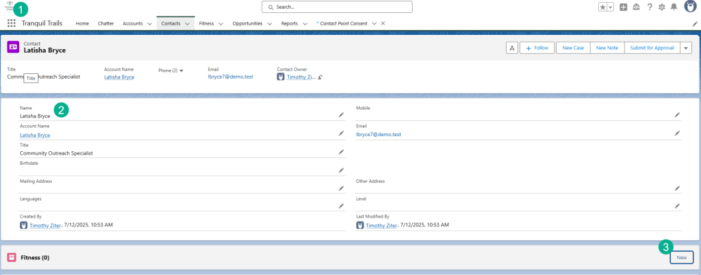 (1) In the nine dots search for Contact to pull you back into CRM home page. In the search bar at the top search for Latisha Bryce.