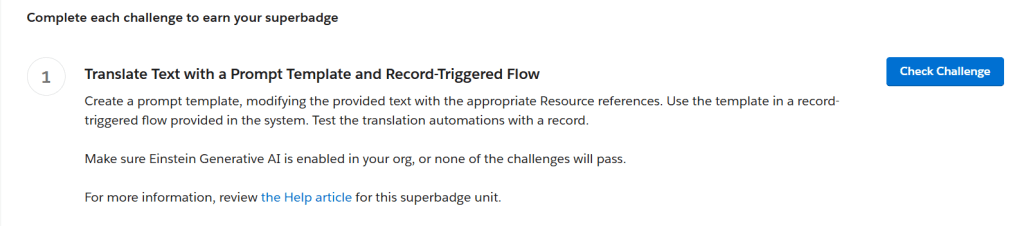 The first exercise is the Prompt Builder Templates Superbadge. Let’s walk through how to accomplish this section. Here’s a link to this Superbadge: https://trailhead.salesforce.com/content/learn/superbadges/superbadge_prompt_builder_templates_sbu?trail_id=become-an-agentblazer-innovator