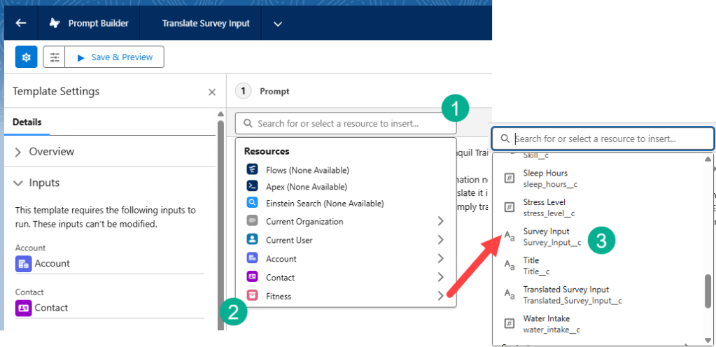 Follow the steps for both [Survey Input Field] variables in the prompt. And the prompt should look like this.